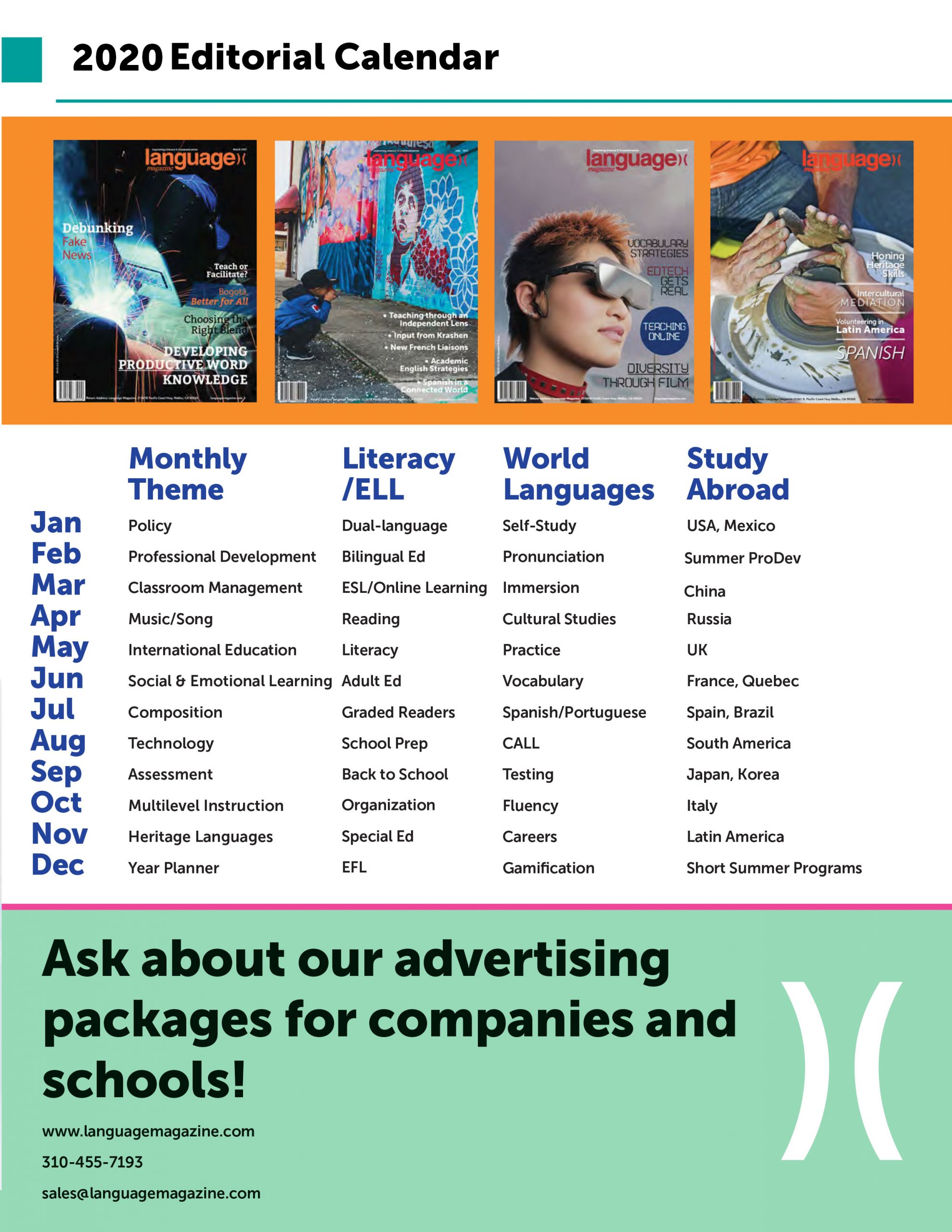 Through promoting multicultural learning, global citizenship, and language education, Language Magazine provides well-researched insight on the literacy and language sphere of education. We also publish each month’s full issue in an app for tablets along with a digital edition that can be viewed or downloaded for subscribers.